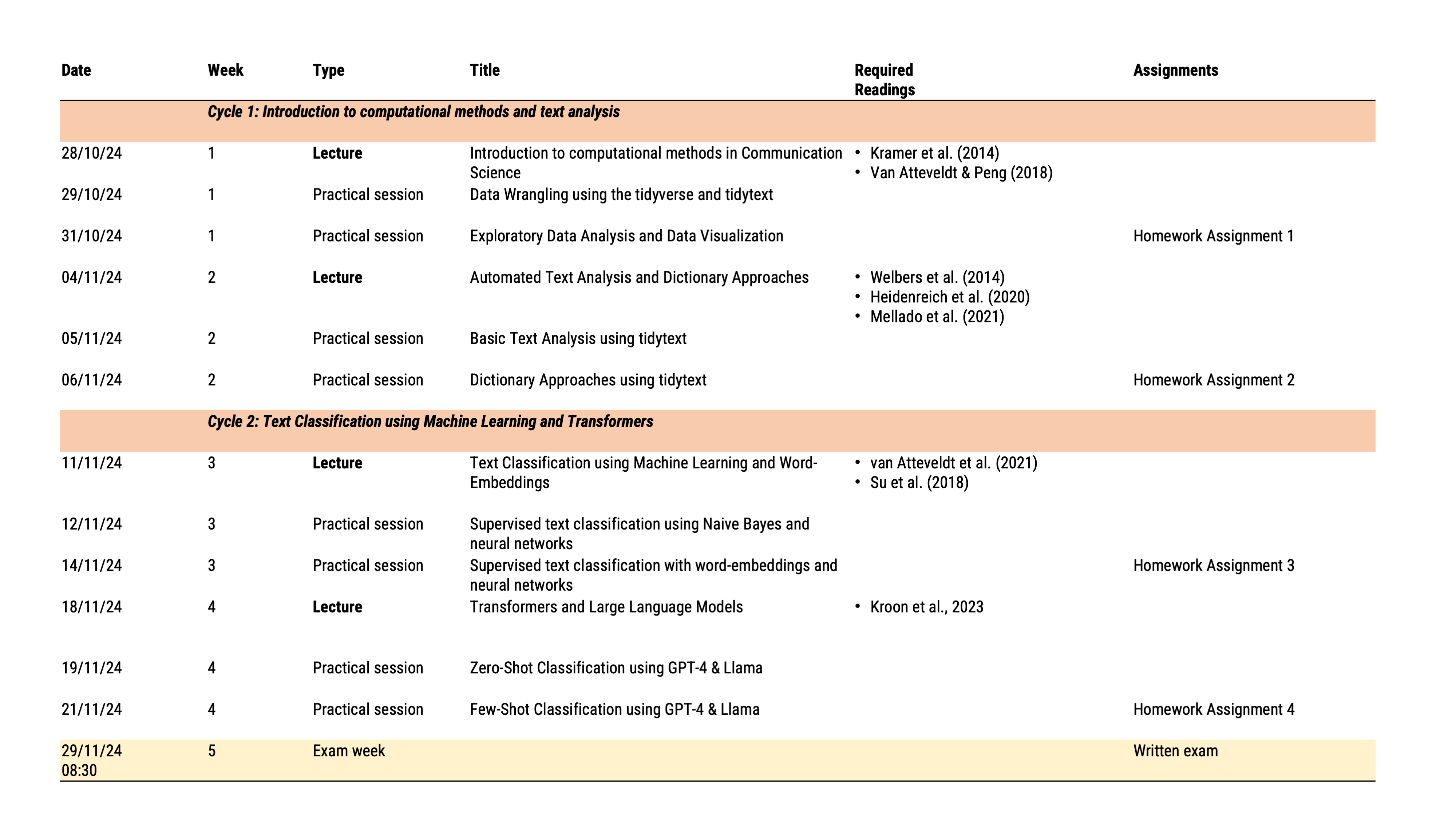 After each week, students are required to hand in a “homework assignment”, which represents a practical application of some of the taught analysis methods (e.g. with a new data set, specific research question) (30% of the final grade):