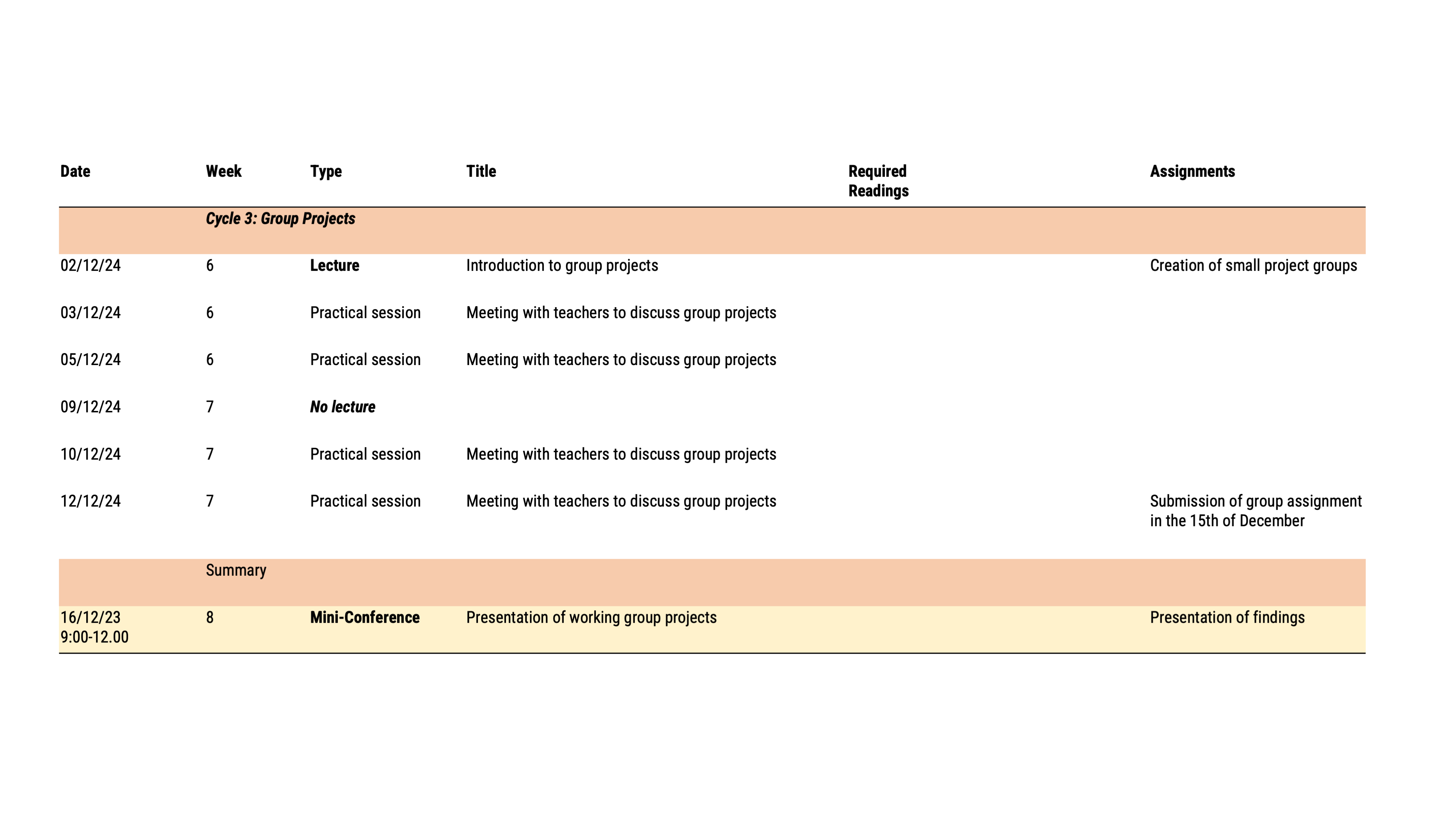 In the third cycle, students will be assigned to small working groups in which they independently conduct a research project. A final poster presentation on the 16th of December (most likely 09.00 to 12.00) will be graded per group (30% of the final grade).