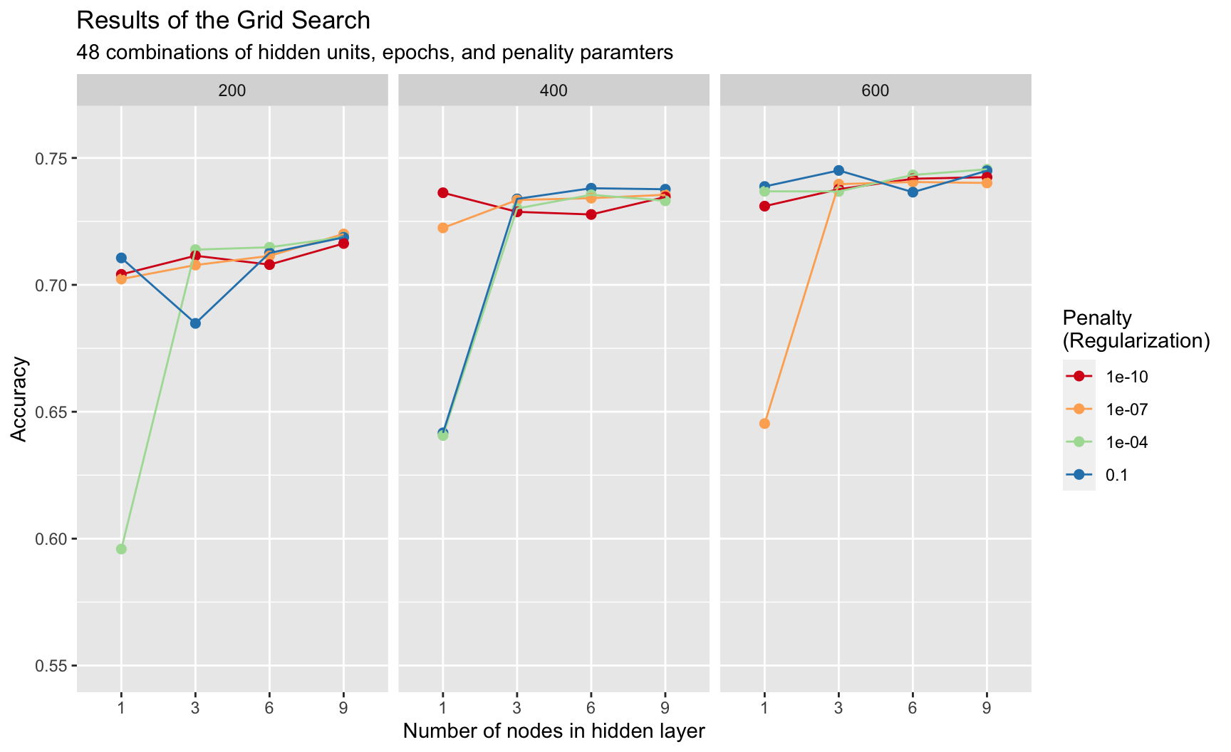 We can see here that 9 nodes in one hidden layer, a penalty of 0.0001 and 600 epochs lead to the best accuracy, but it is actually worse than our original model with 6 nodes and a penalty of 0.001 and 400 epochs