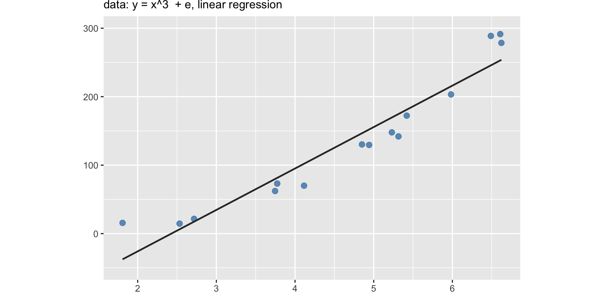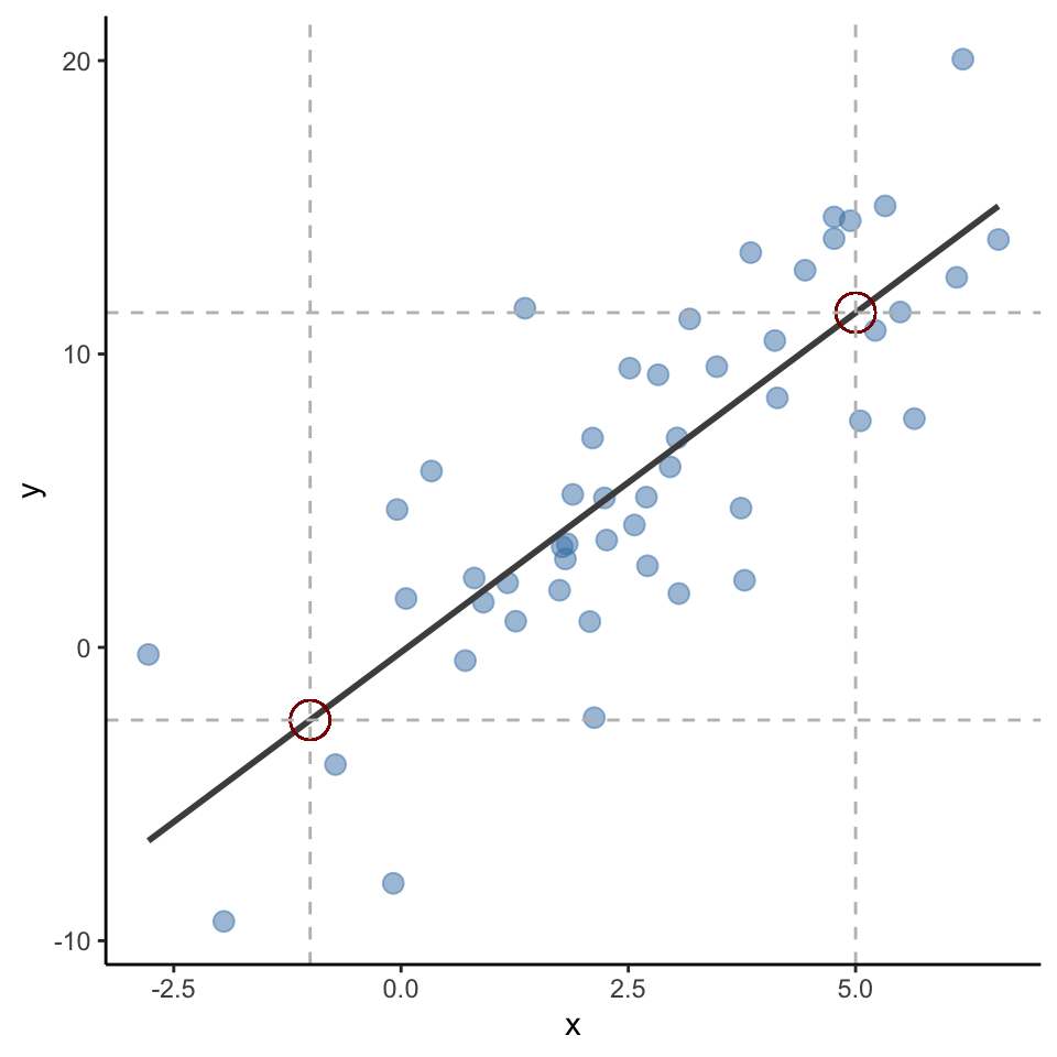 For example, despite not being in the data, \(x = -1\) should be \(y = -2.47\); \(x = 5\) should be \(y = 11.41\) based on the fitted line