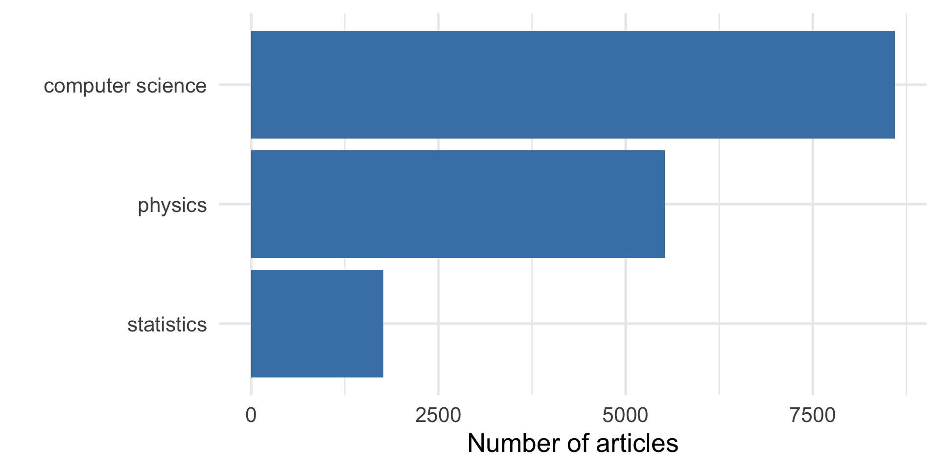# ℹ 15,870 more rowsThe data contains articles from computer science, physics, and statistics