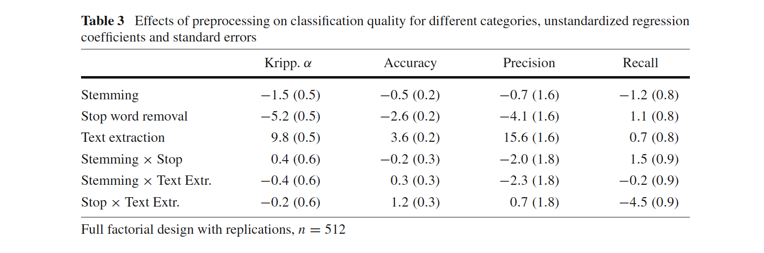 All text-preprocessing steps (e.g., stopword removal, stemming, frequency trimming,etc.) may change the performance, but no clear rules on what works and what does not
