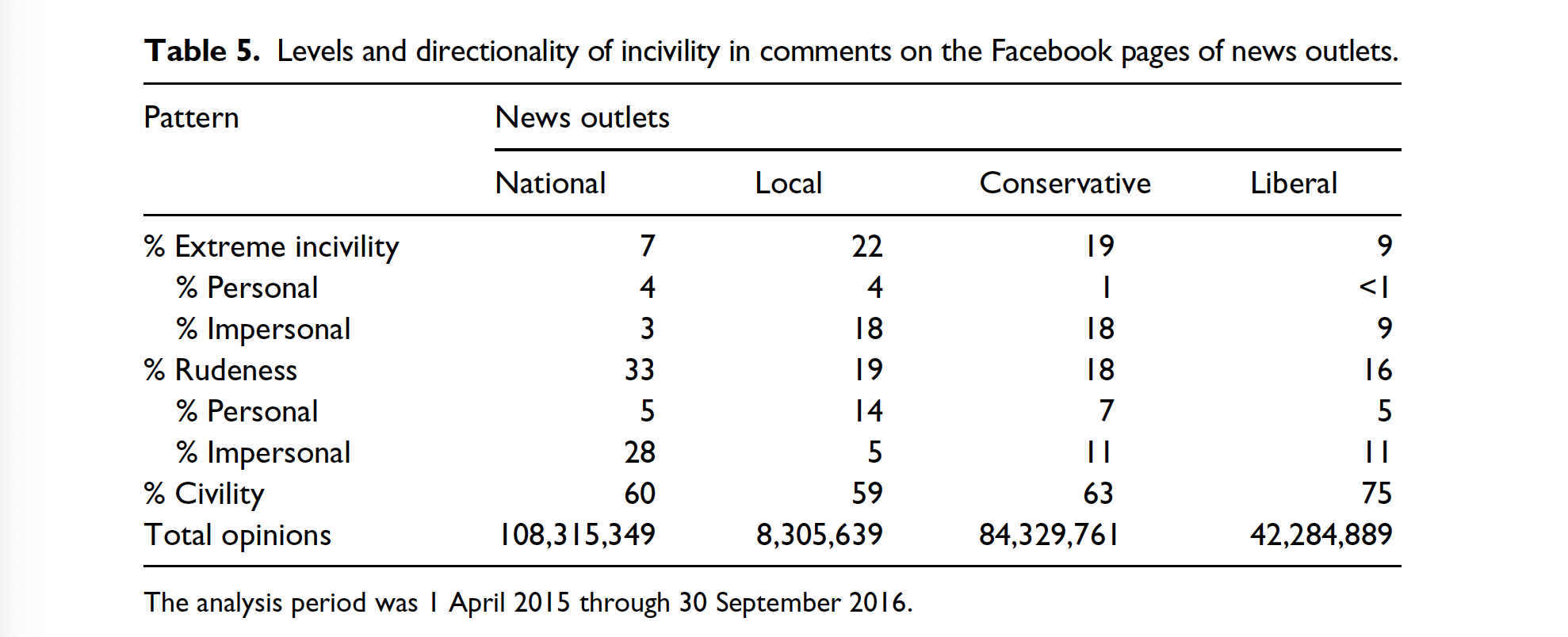 Su, L. Y.-F., Xenos, M. A., Rose, K. M., Wirz, C., Scheufele, D. A., & Brossard, D. (2018). Uncivil and personal? Comparing patterns of incivility in comments on the Facebook pages of news outlets. New Media & Society, 20(10), 3678–3699. https://doi.org/10.1177/1461444818757205