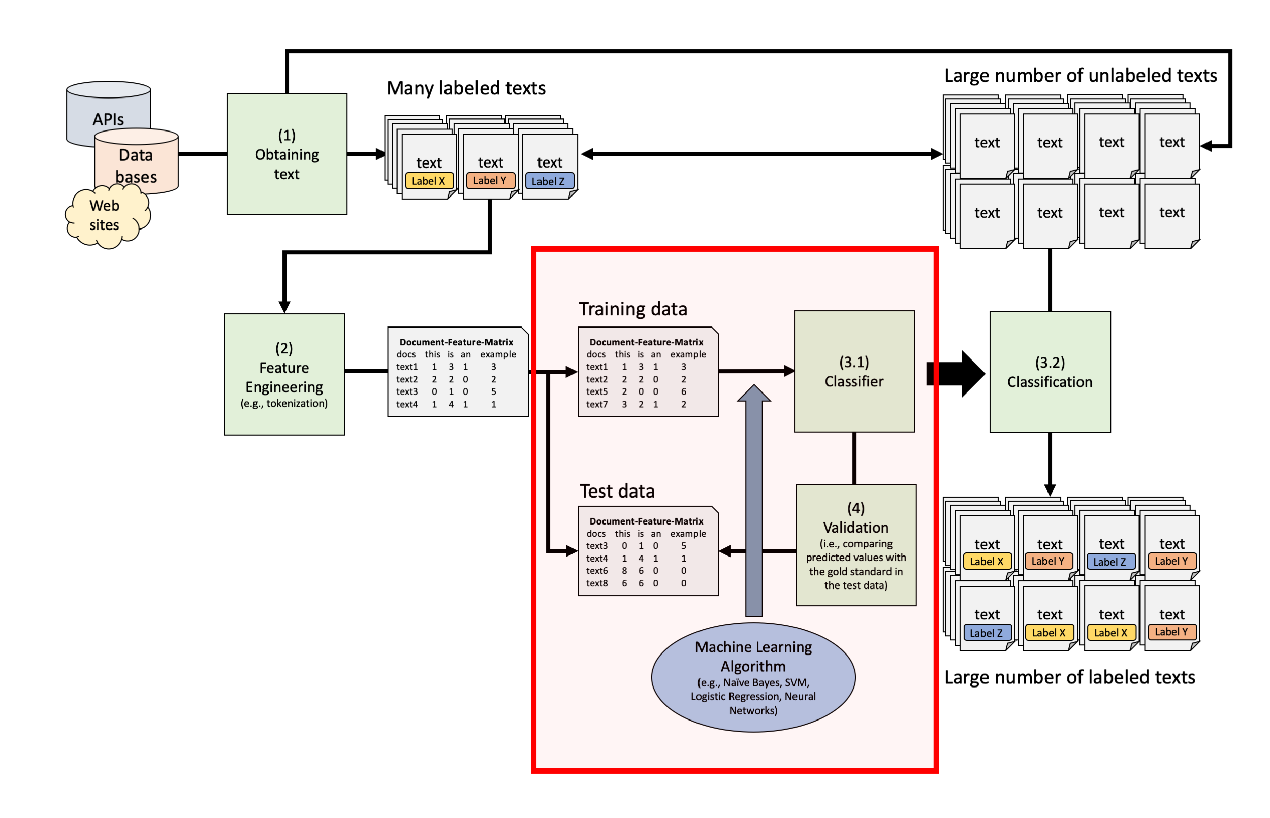 Any supervised machine learning procedure to analyze text usually contains at least 4 steps: