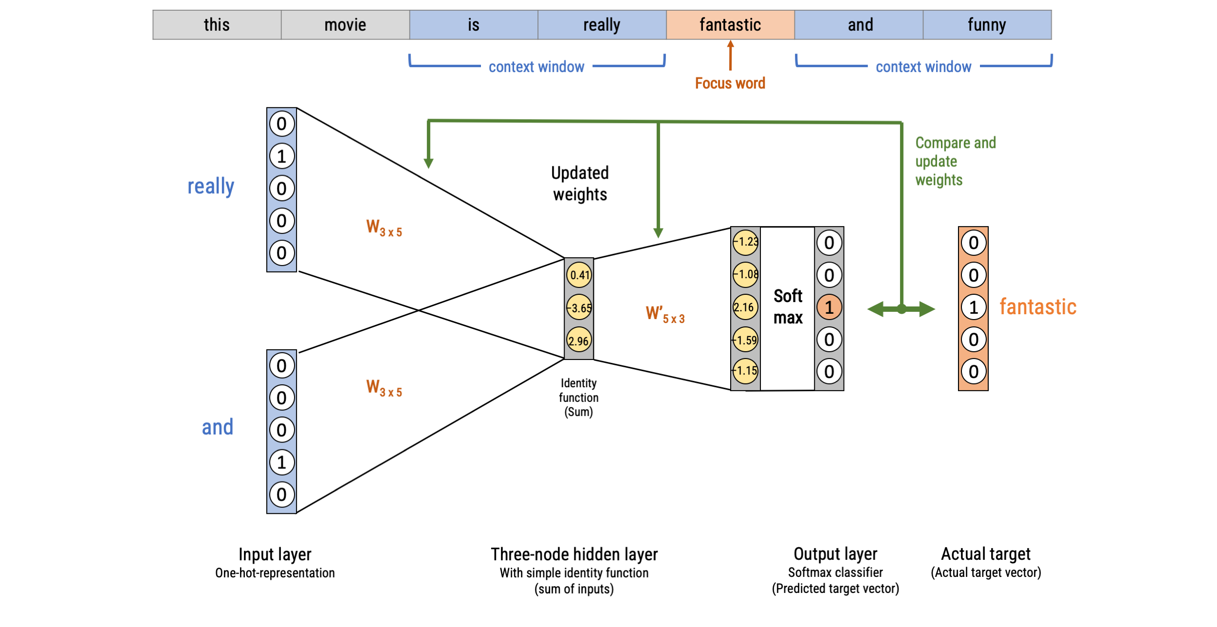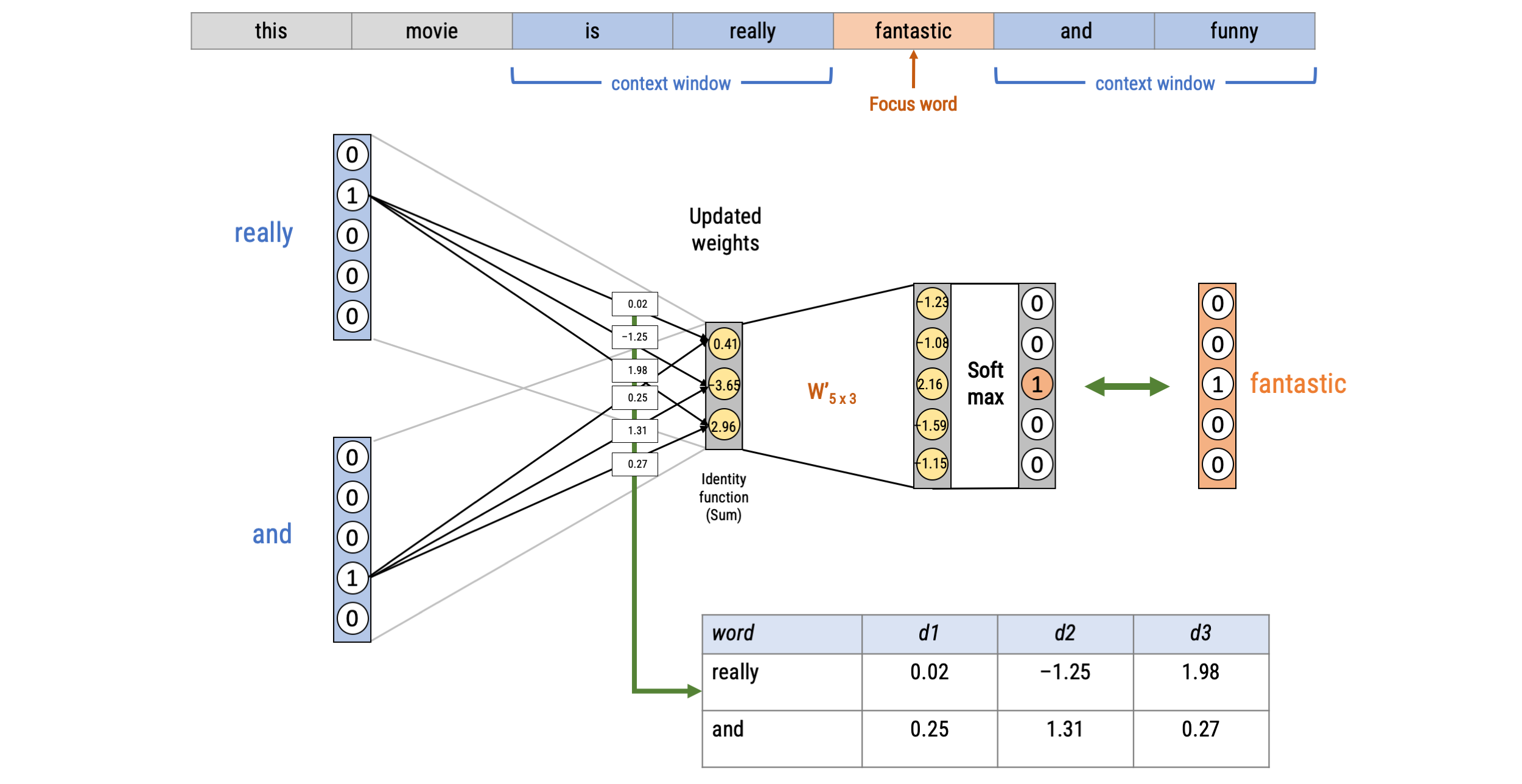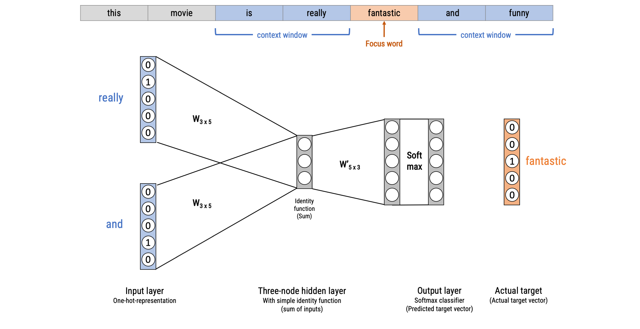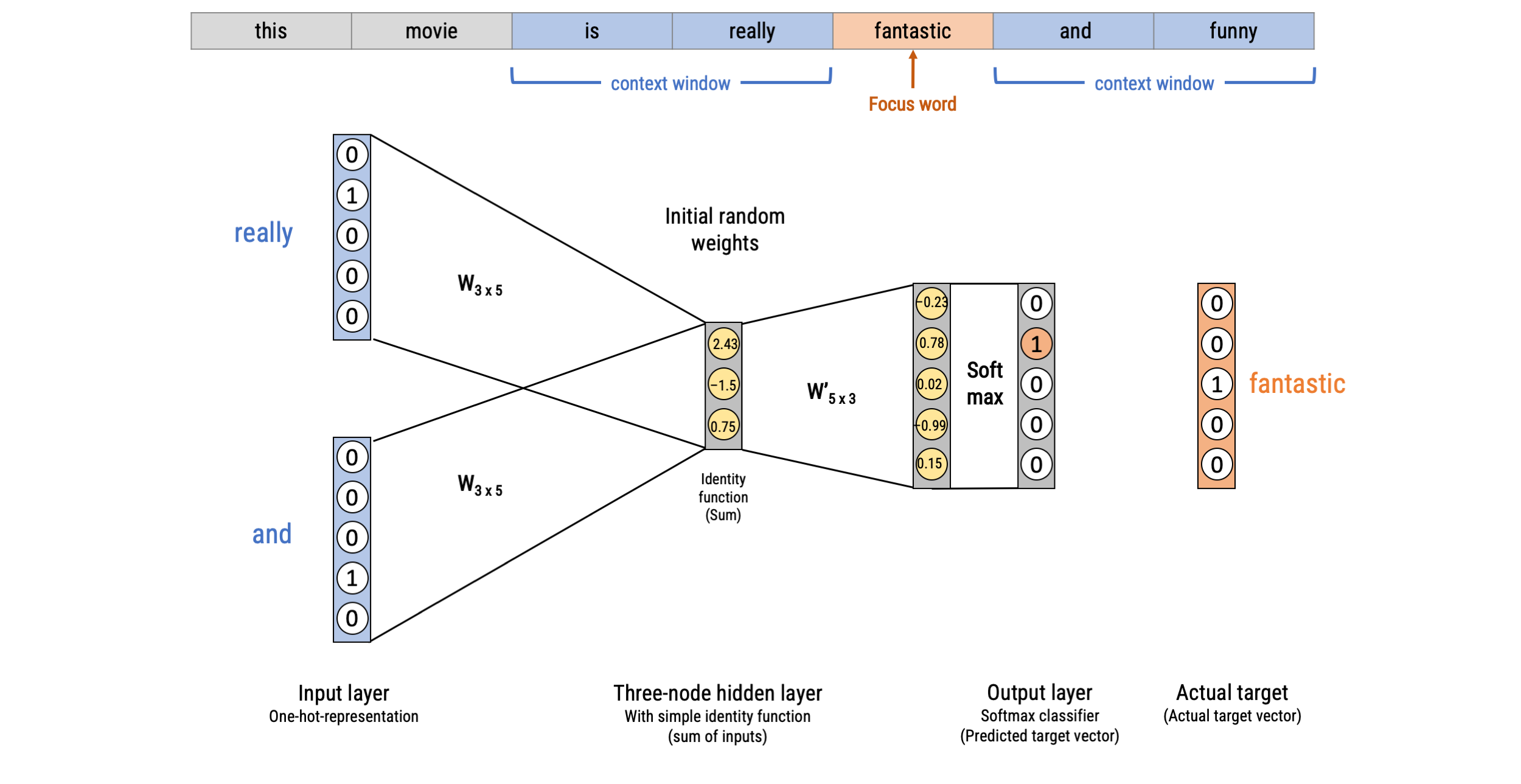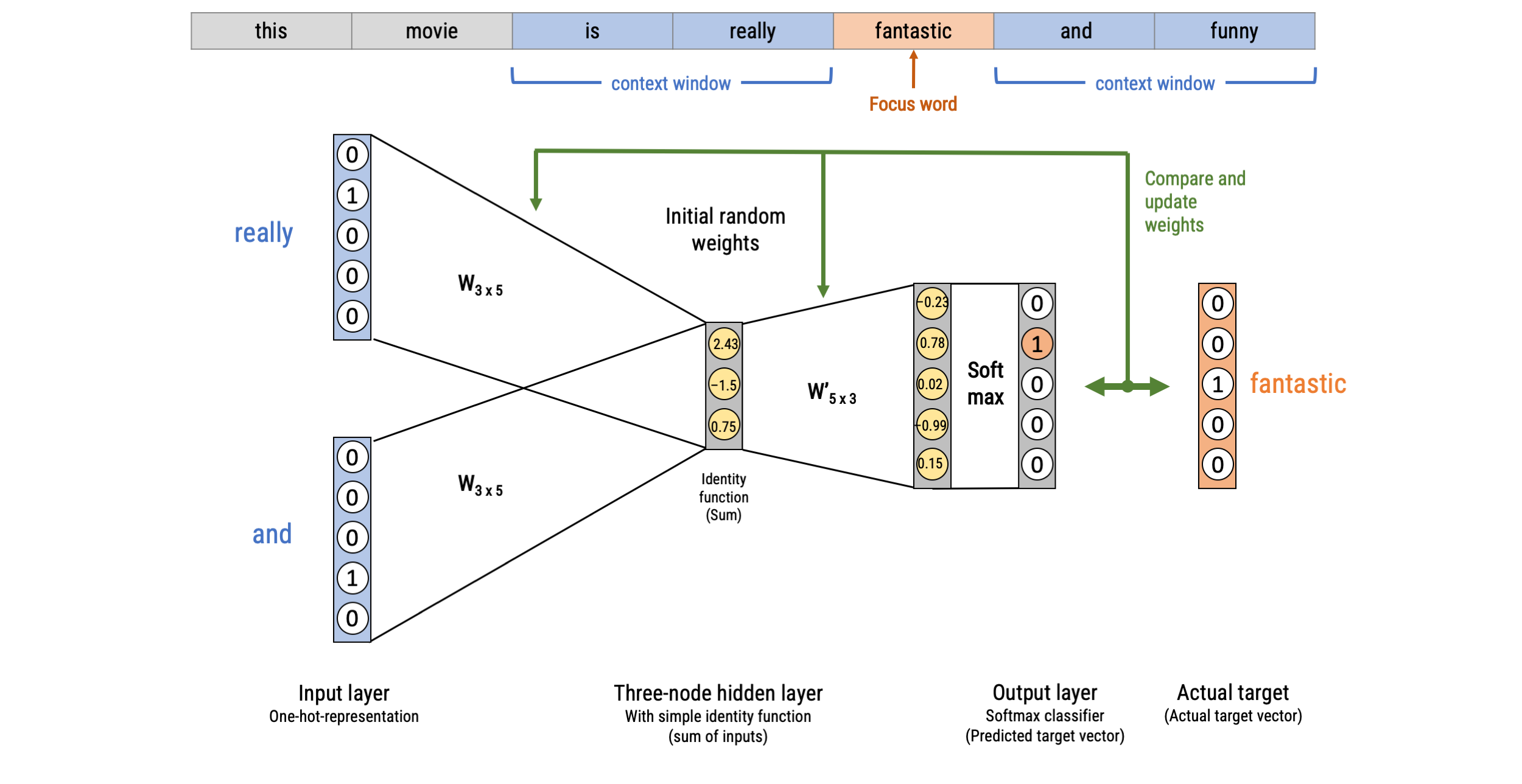 Learning word embeddings using a shallow neural network and context windows (e.g., word2vec)