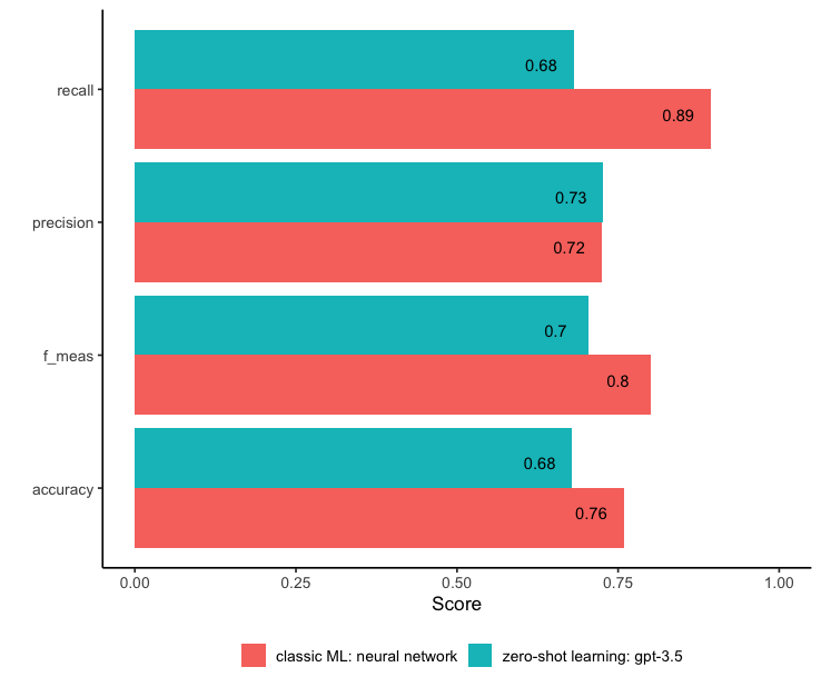 Let’s compare the zero-shot performance of GPT-3.5 against our best neural network classifier from last week in predicting genre from music lyrics.